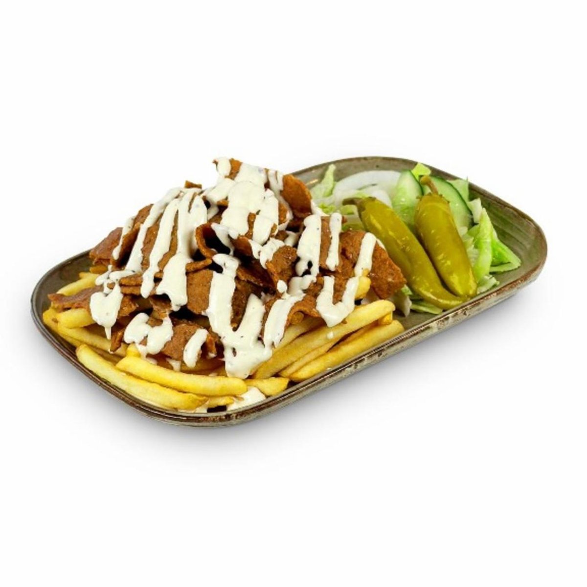 Pommes, isbergssallad, gurka, lök, kebabkött (fläskkarré), feferoni + valfri dressing ingår