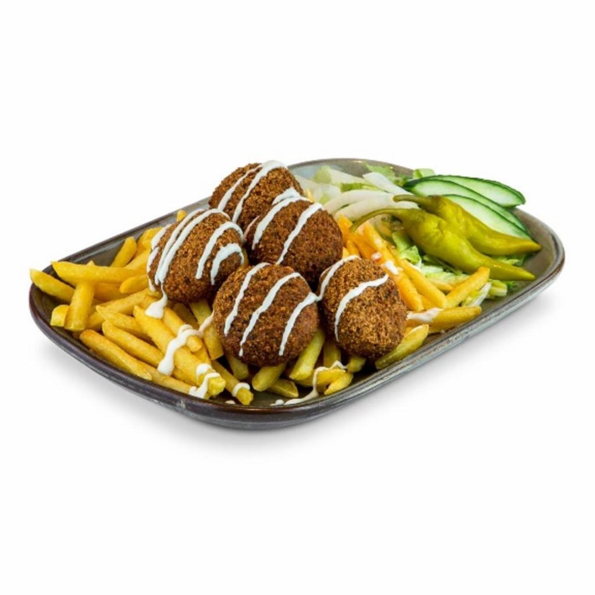 Pommes, isbergssallad, gurka, lök, falafel, feferoni + valfri dressing ingår
