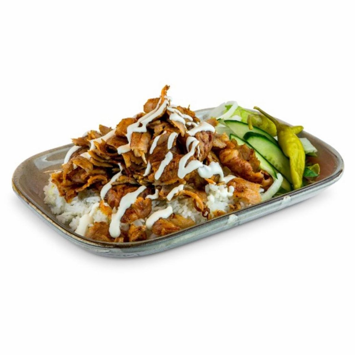 Ris, isbergssallad, gurka, lök, kebabkött (fläskkarré), feferoni + valfri dressing ingår