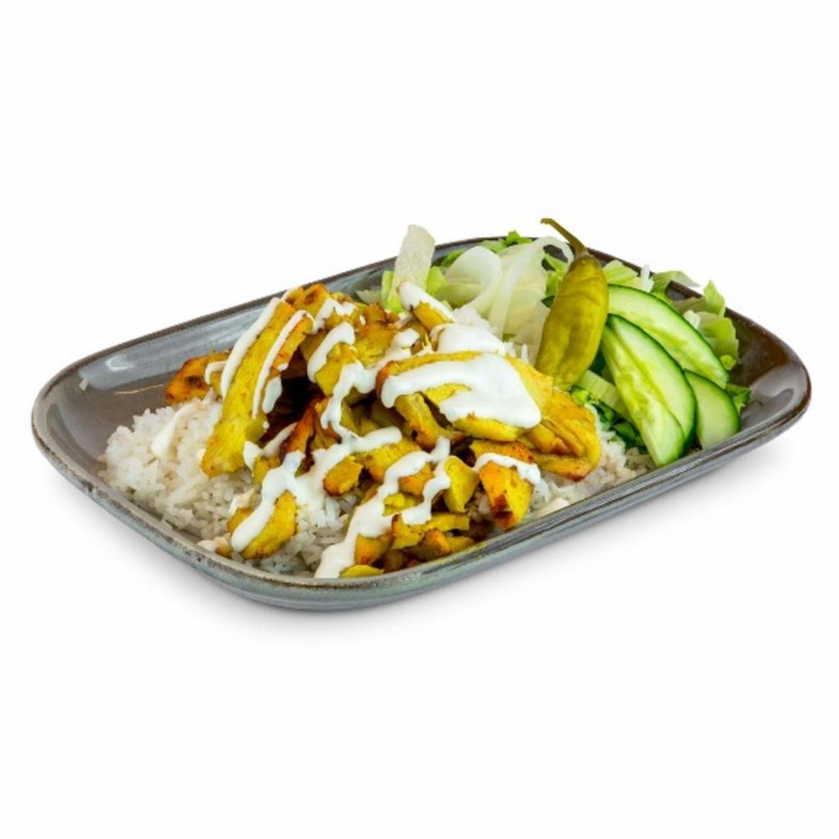 Ris, isbergssallad, gurka, lök, currymarinerad kycklingfilé, feferoni + valfri dressing ingår