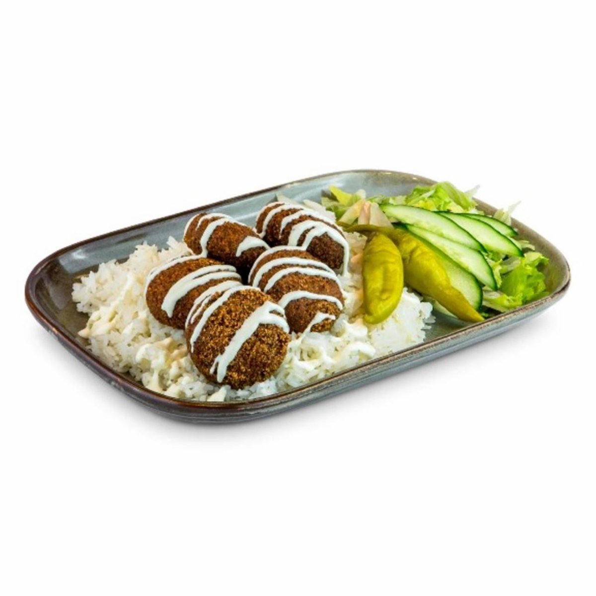 Ris, isbergssallad, gurka, lök, falafel, feferoni + valfri dressing ingår