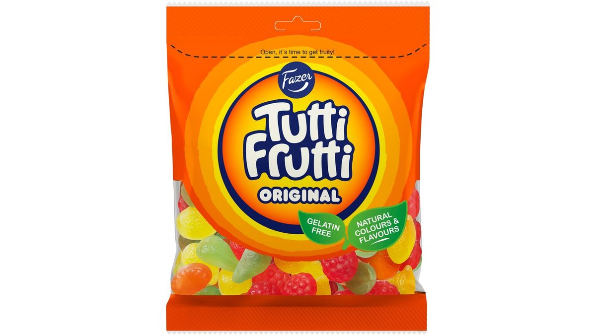"Tutti Frutti Original är en godispåse från Fazer med smak av hallon, päron, citron och unika Tutti Frutti. Perfekt godis för både barn, vuxna och dig som är vegan då Tutti Frutti är gelatinfri och vegansk. Den är tillverkad med naturliga färg och smakämnen från naturliga juicer och färger från både frukt och grönsaker. "