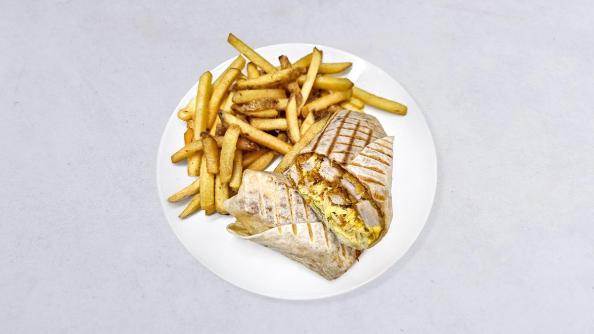 Grillad kycklingfilé marinerad med curry, sallad, tomat och majonnäs, rullat i tortilla. Pommes ingår.