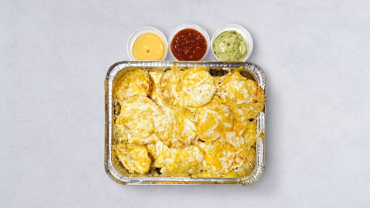 Kyckling, cheddarost, edamerost, köttfärs, tomat lök, majs och valfri sås.