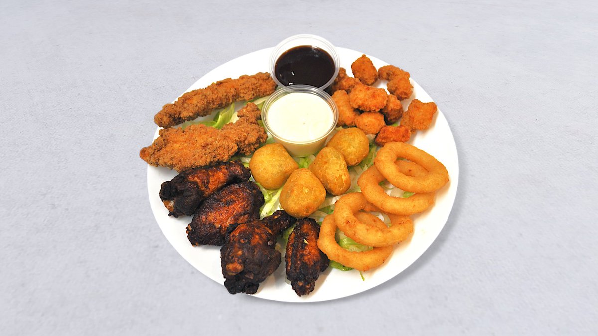 4 st buffalo wings, 4 st onion rings, 4 st chili cheese, 2 st chicken tendar, 8 st chicken popcorn och två sås.