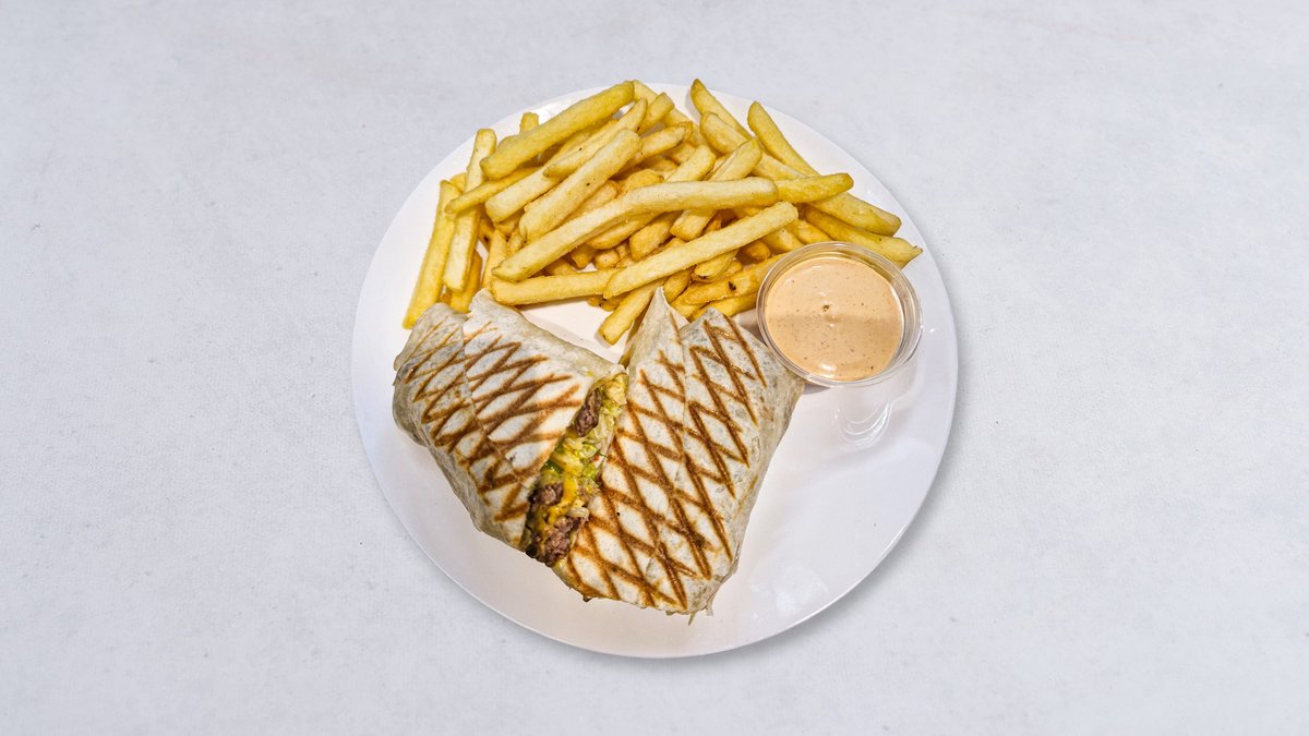 Burgare, nöttkött, cheddarost, sallad, tomat och hamburgerdressing rullat i tortilla. Pommes ingår.