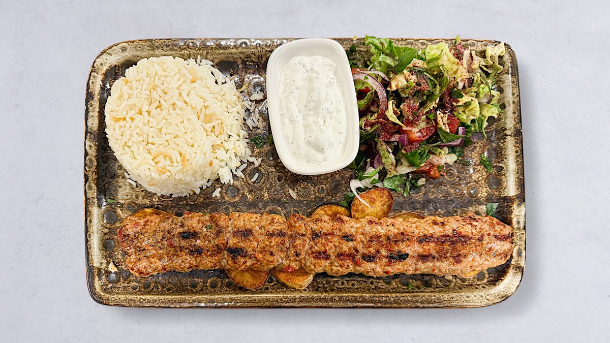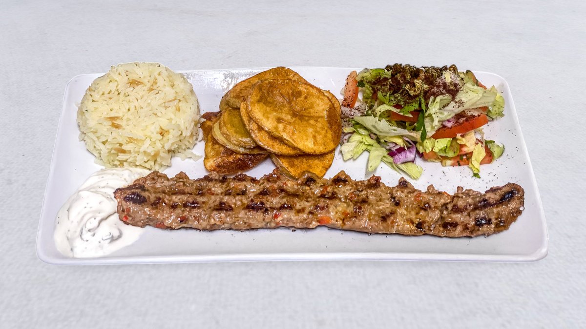 Serveras med pommes sallad och kebabsås.