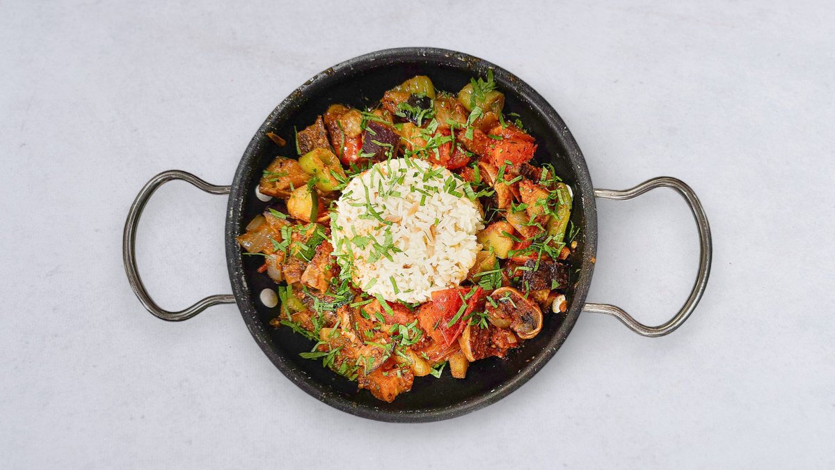 Serveras med potatis, stekta grönsaker grillad tomat och paprika och pepparsås.