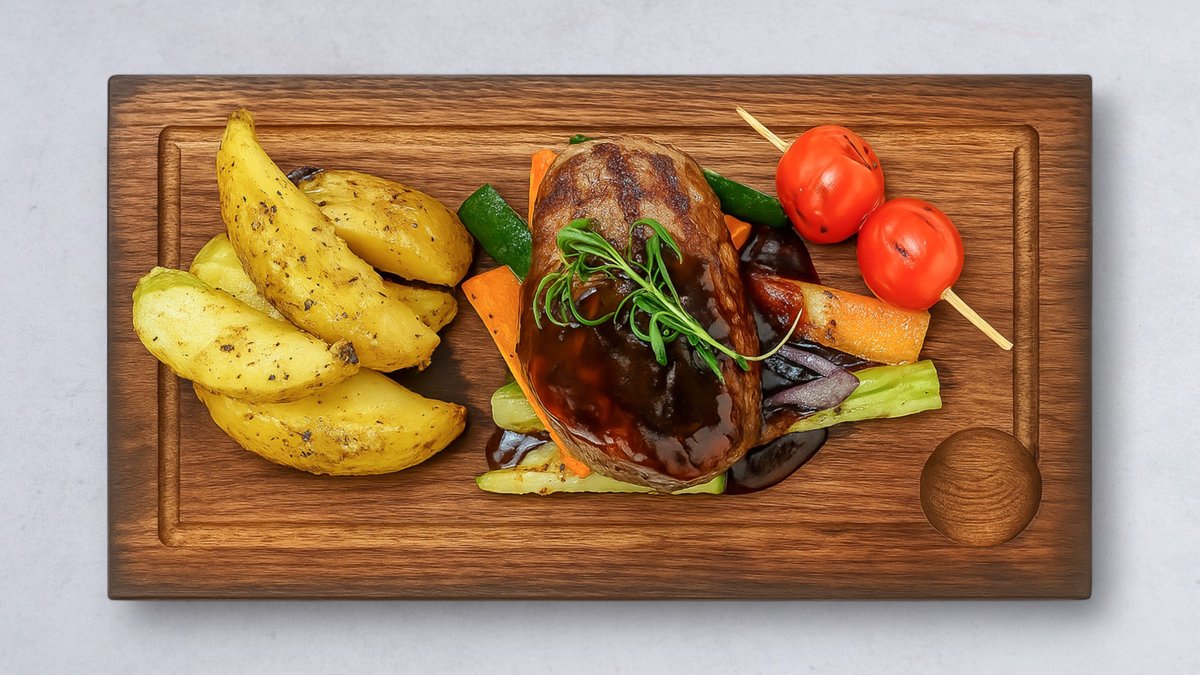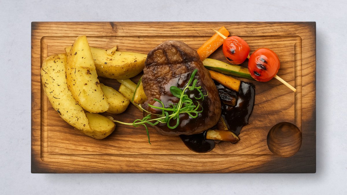 Serveras med stekt potatis, stekta grönsaker grillad tomat och paprika och rödvinssås.