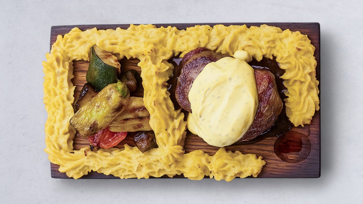 Serveras med potatismos, stekta grönsaker rödvinssås och bearnaisesås.