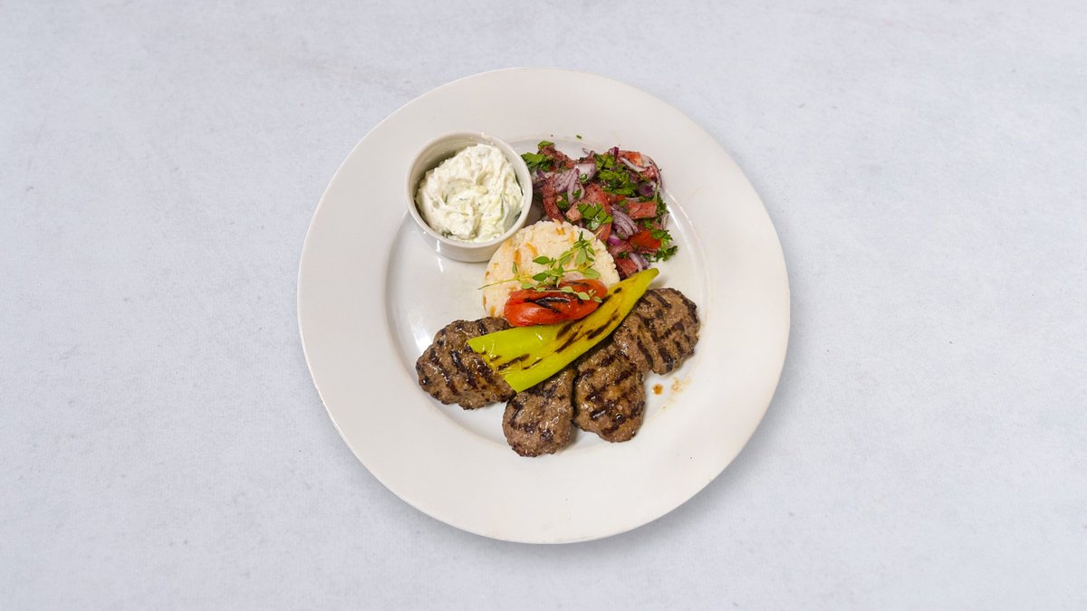 Serveras med klyftpotatis, sallad, grillad tomat och paprika och yoghurtsås.