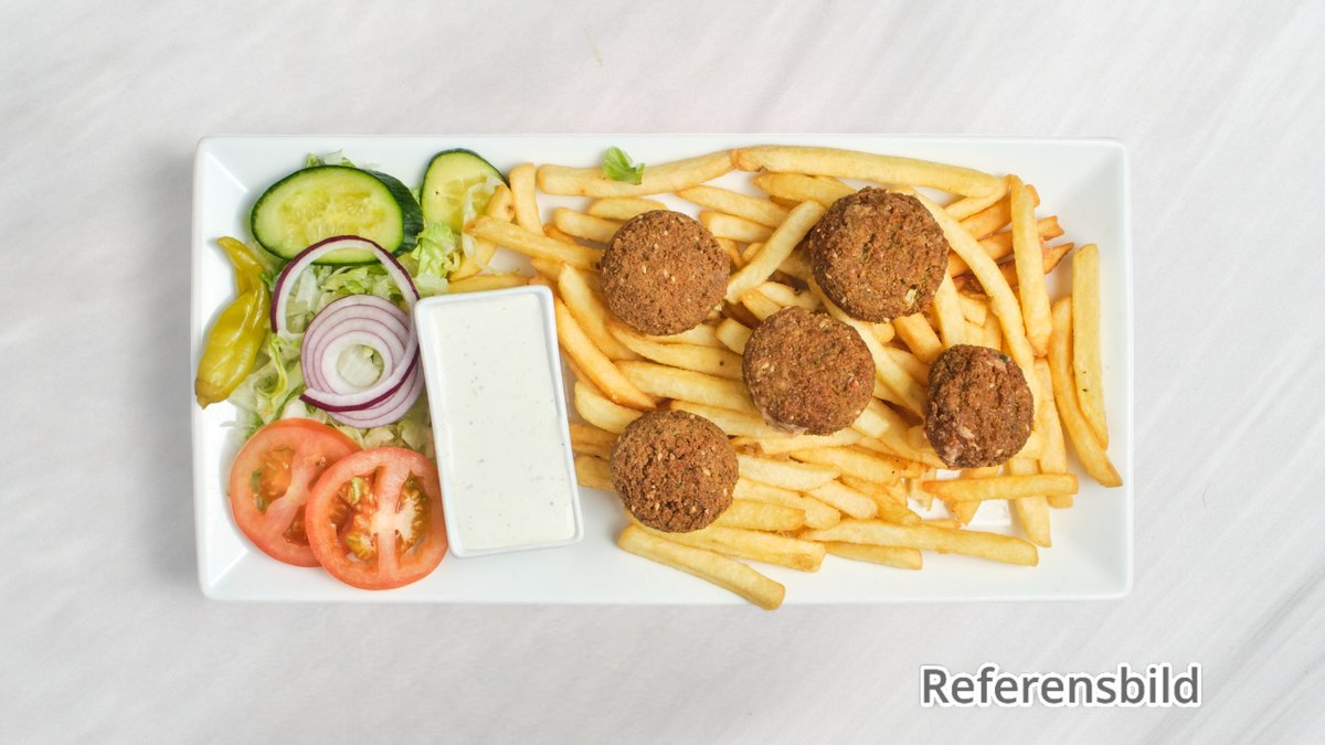 Kikärtsbollar, sallad, tomat, gurka, lök, peperoni, bröd och pommes. Välj sås i nästa steg.