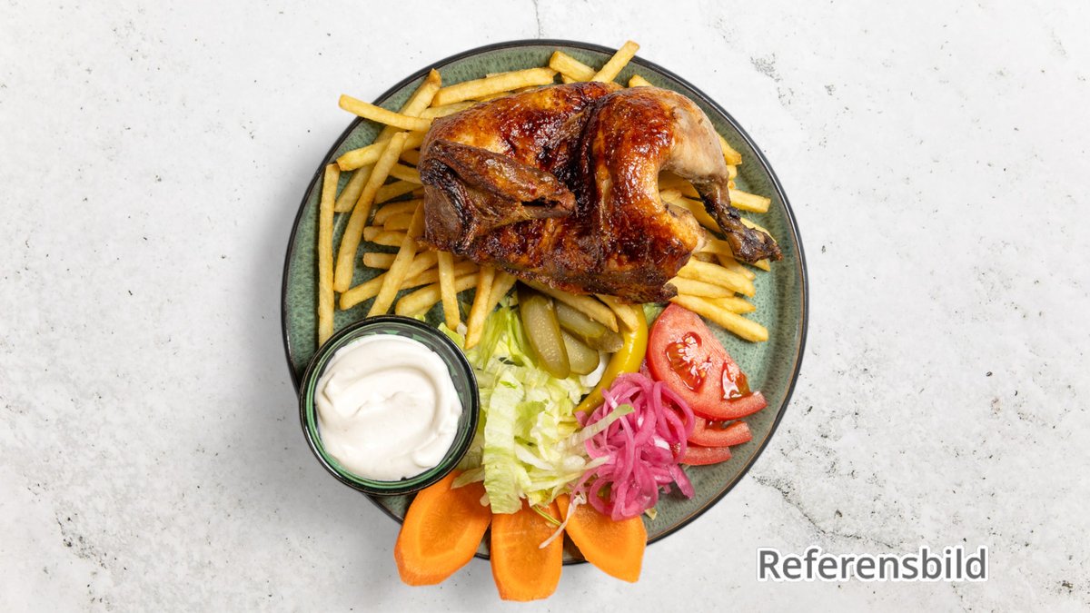 Serveras med sallad, tomat, chilimayo och pommes. Valfri 33 cl dryck ingår.