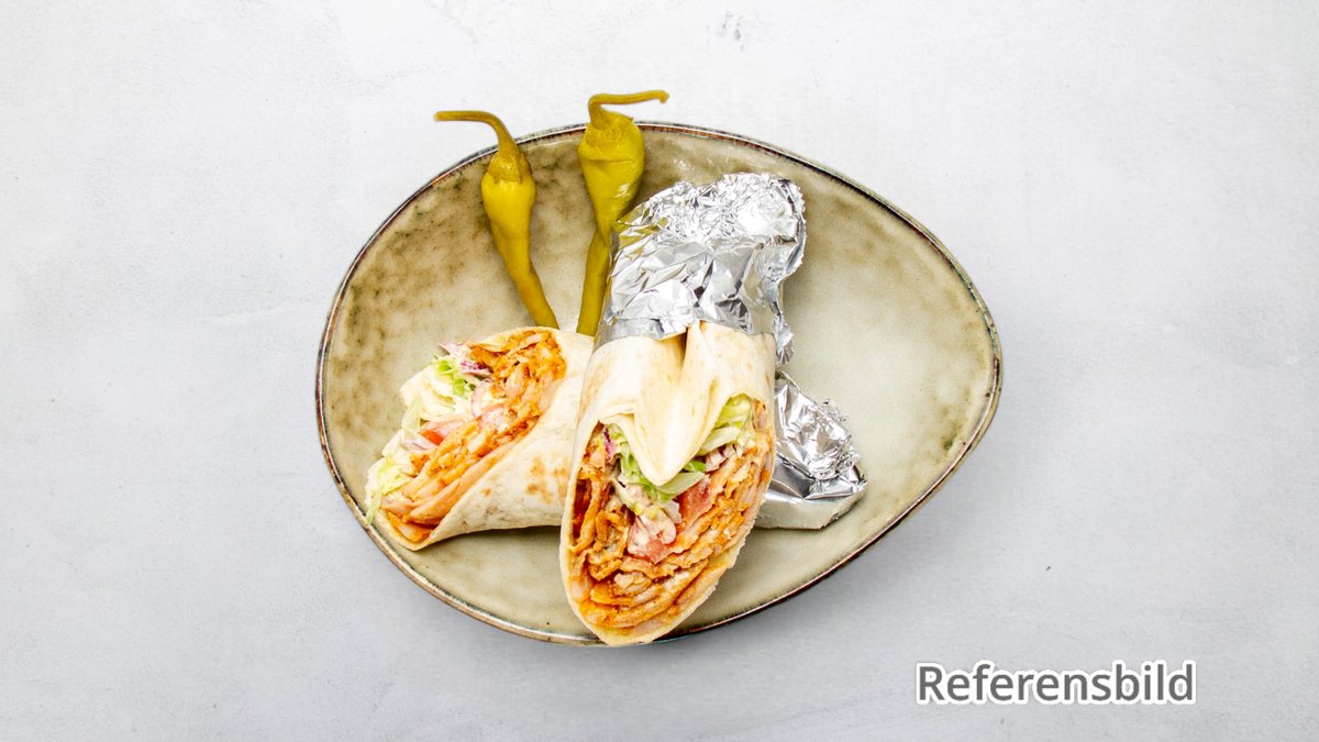 Hummus, sallad, tomat, gurka, lök, saltgurka och mild sås. Pommes ingår.