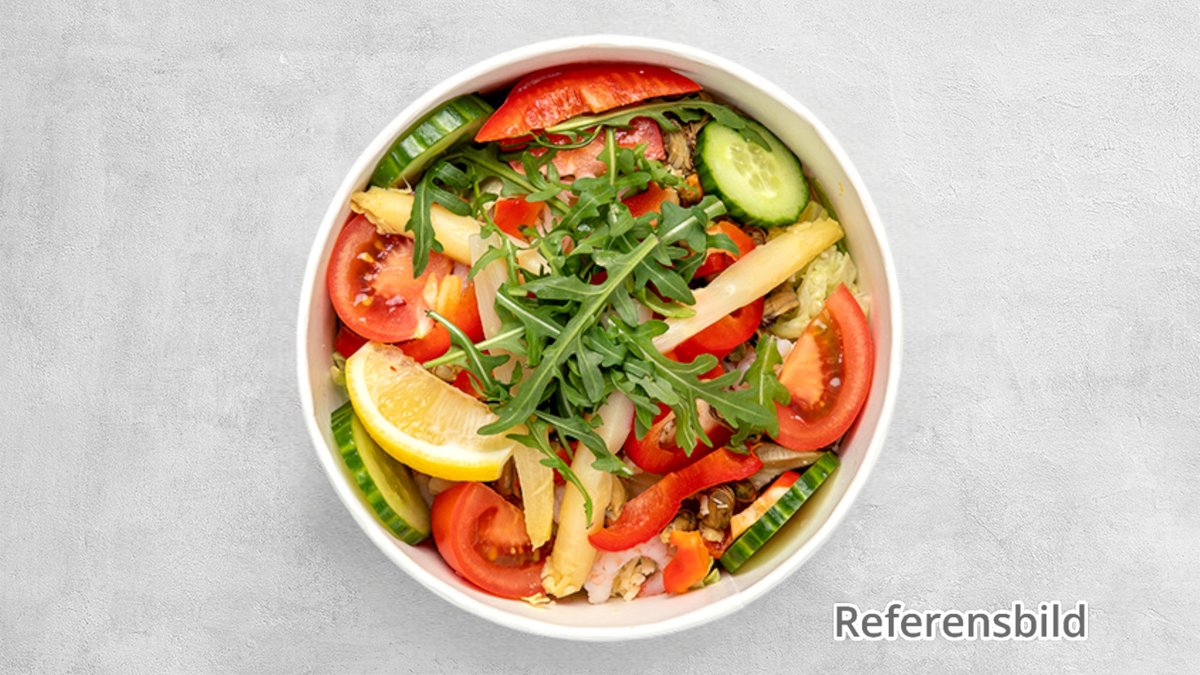 Vegansk kebab, isbergssallad, tomat, gurka, rödlök, rostad lök, pepperoni, vegansk sås.