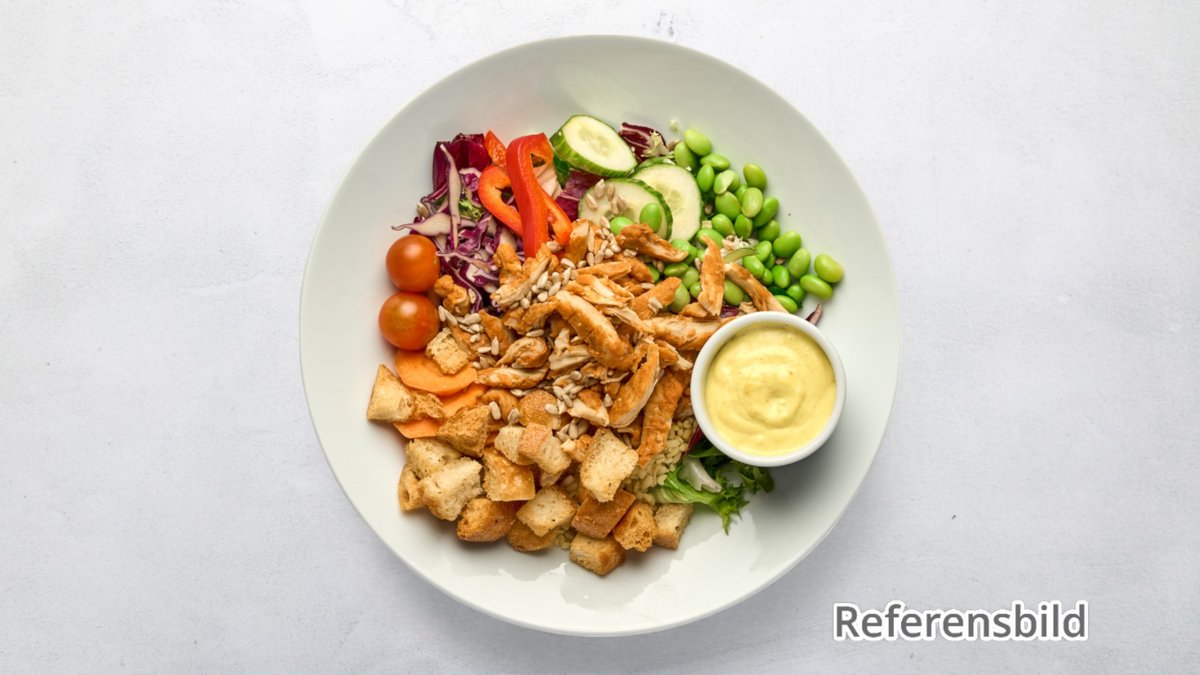 Kycklingkebab, isbergssallad, tomat, gurka, rödlök, majs, pepperoni och valfri sås.