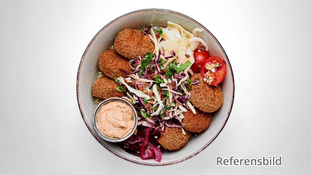 Falafel, isbergssallad, tomat, gurka, rödlök, vitost, majs, pepperoni och valfri sås.
