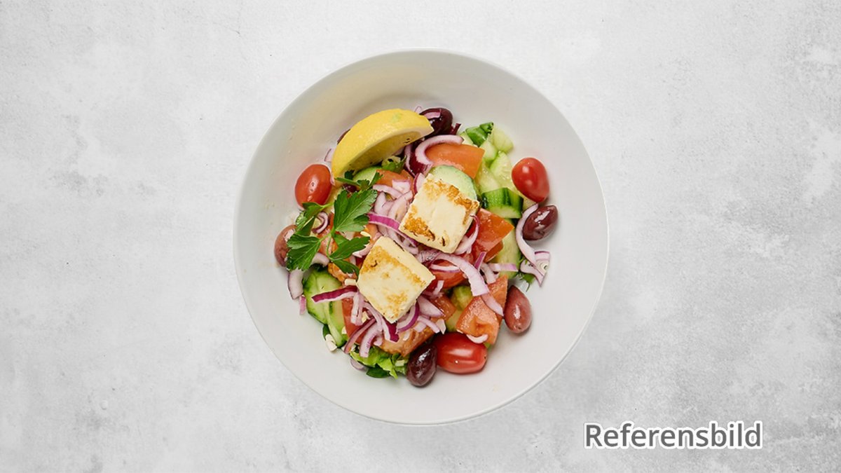 Grillad halloumiost, isbergssallad, tomat, gurka, rödlök, rostad lök, pepperoni och valfri sås. Serveras med valfritt tillbehör.