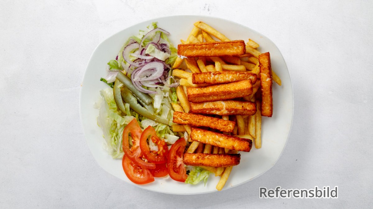 Halloumiost, krispig sallad, lök, tomat, gurka, senap, ketchup och pommes.