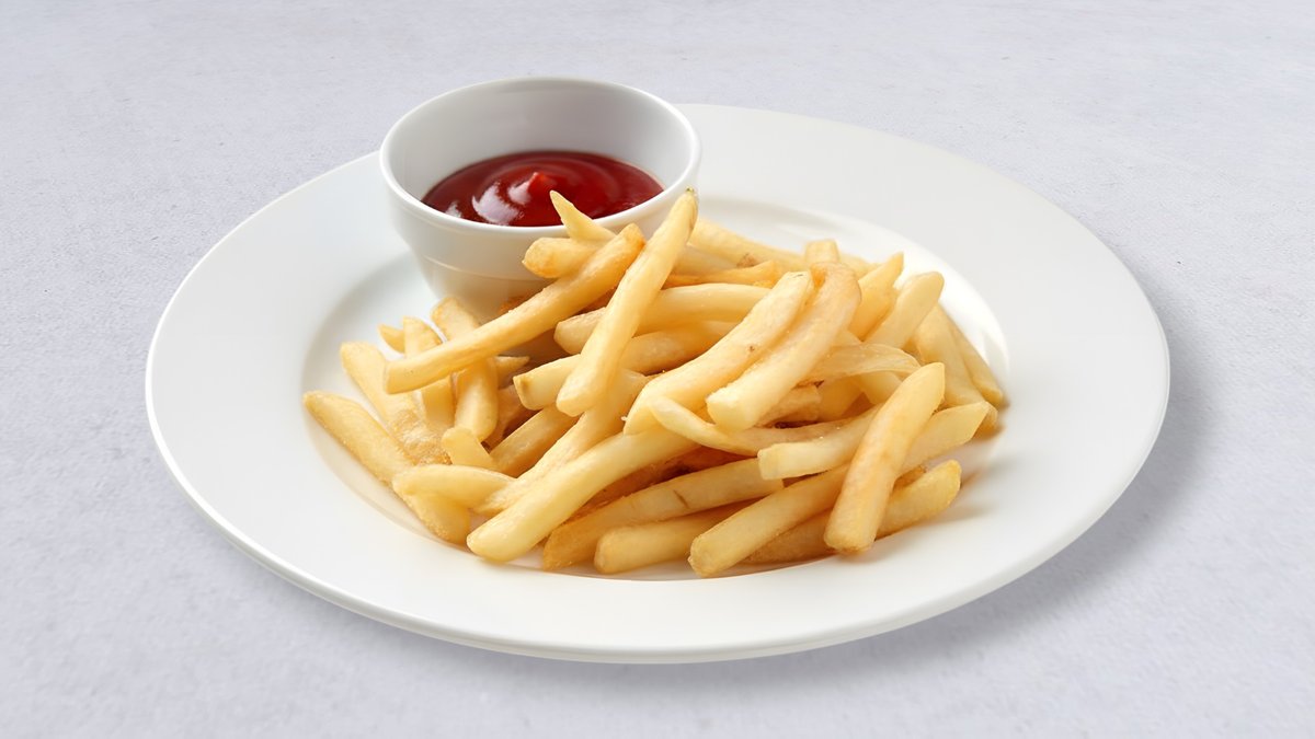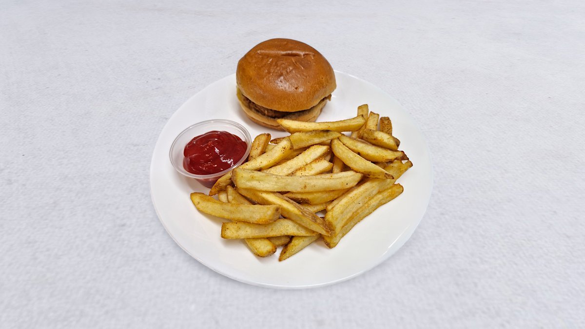 Burgare med 100 g kött, cheddarost, ketchup och pommes.