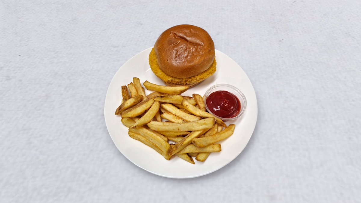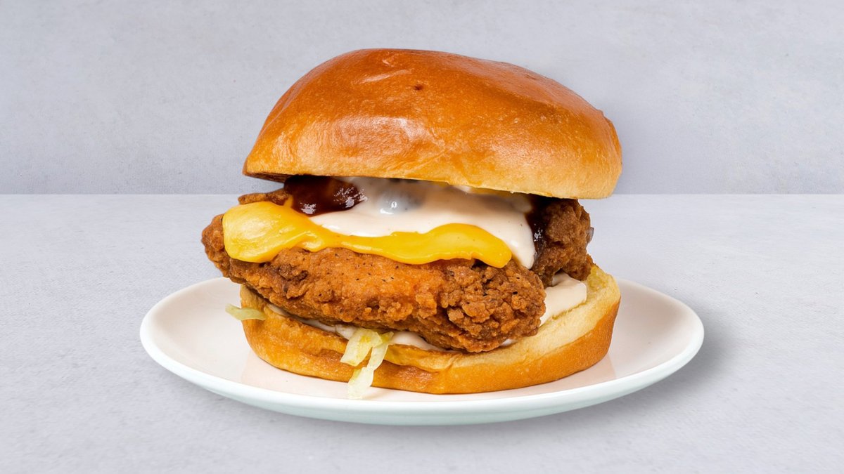 Burgare med panerad kyckling, cheddarost, rostad lök, sallad, coleslaw, sweet chilisås och pommes.
