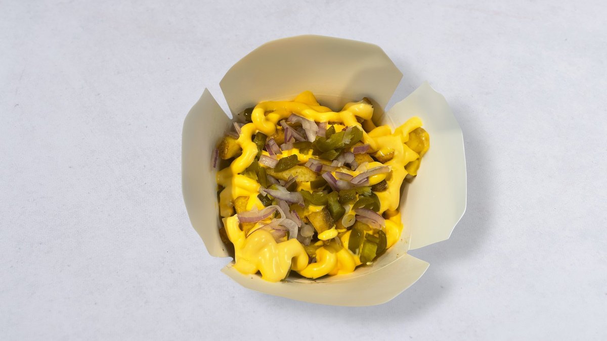 Serveras med pommes, rödlök, jalapeño och cheddarsås.