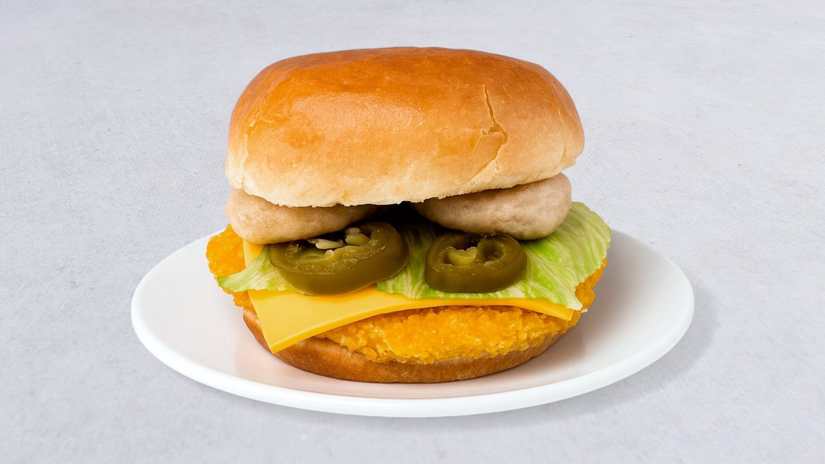 Burgare med panerad kyckling, cheddarost, 2 st chili cheese, jalapeño, sallad, chilimajo och pommes.