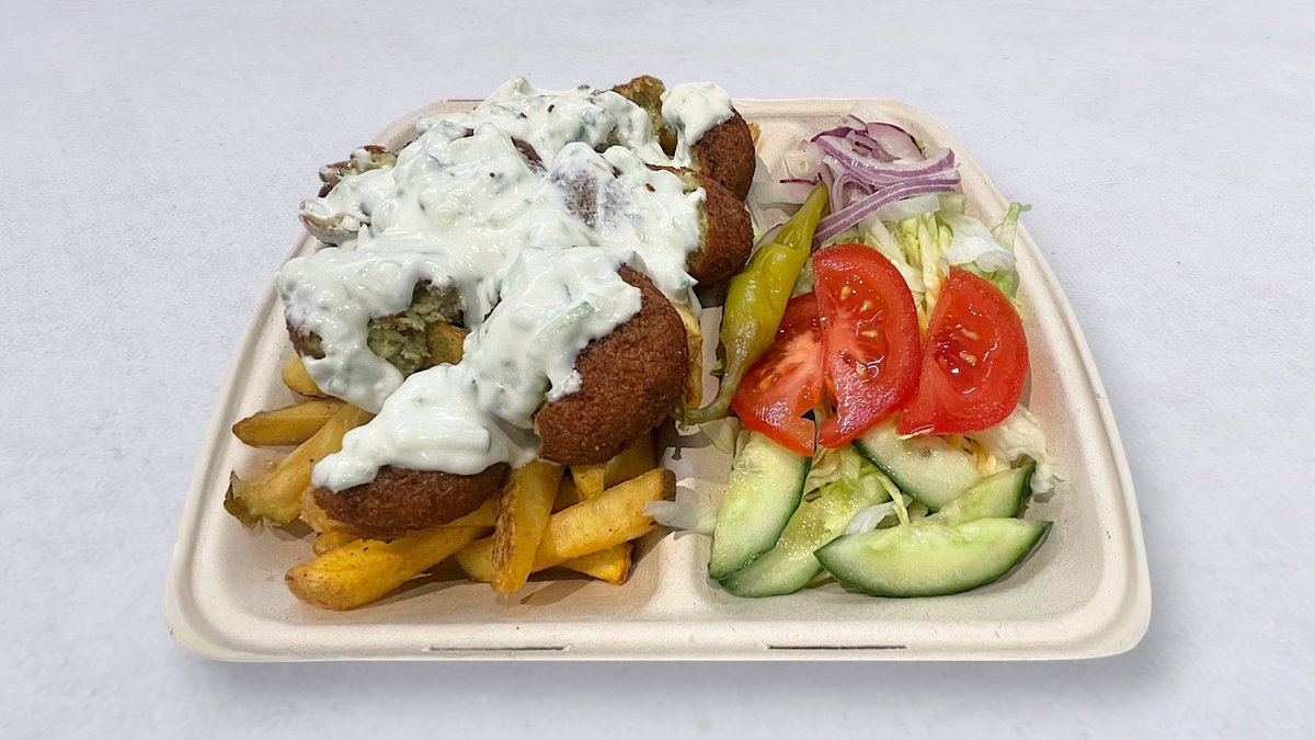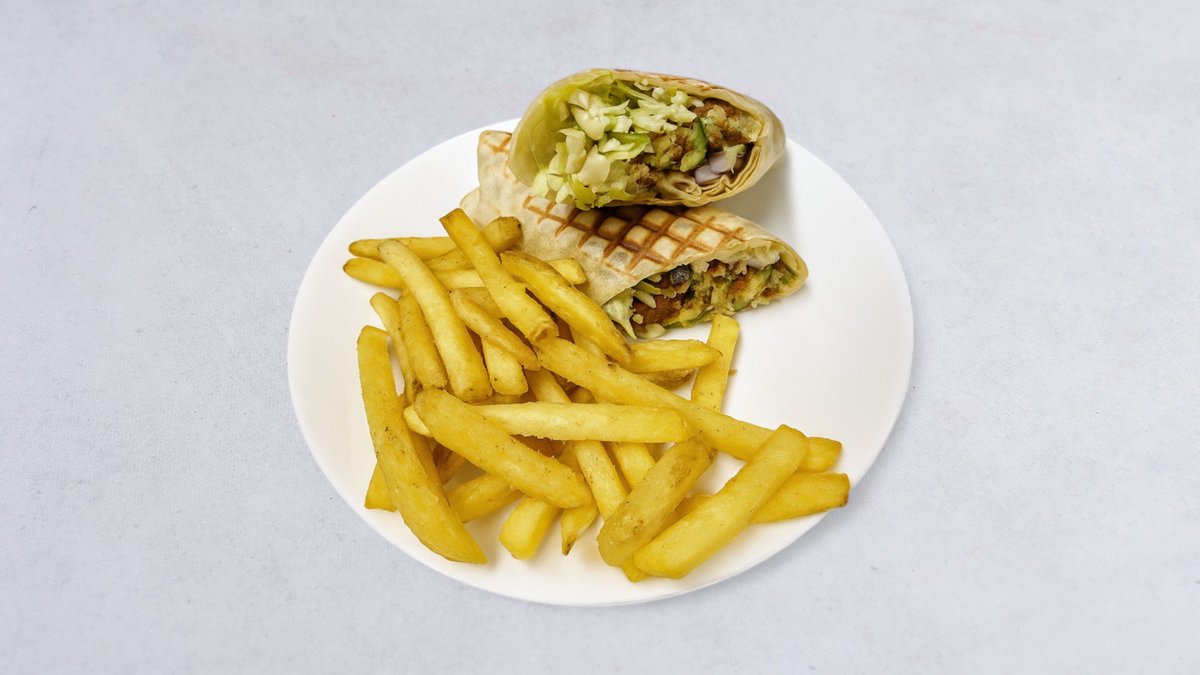Grillad falafel rulle med lök tomat sallad gurka och valfri sås inkl pommes.