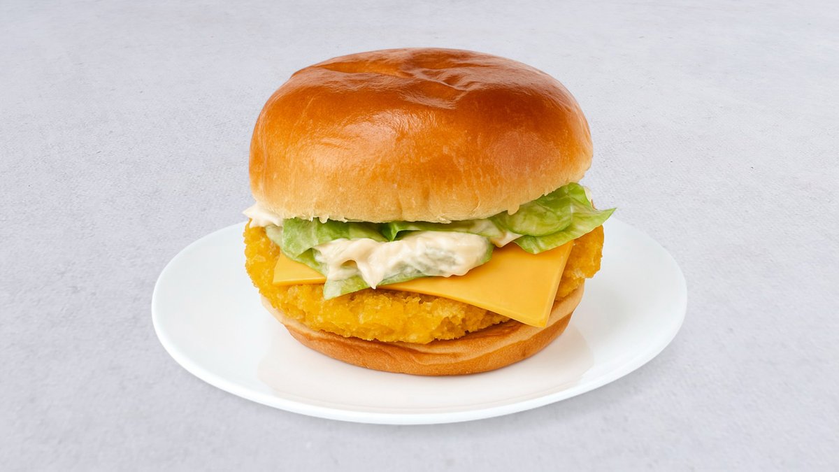 Burgare med panerad kyckling, cheddarost, tomat, lök, saltgurka, sallad, tryffelmajo och pommes.