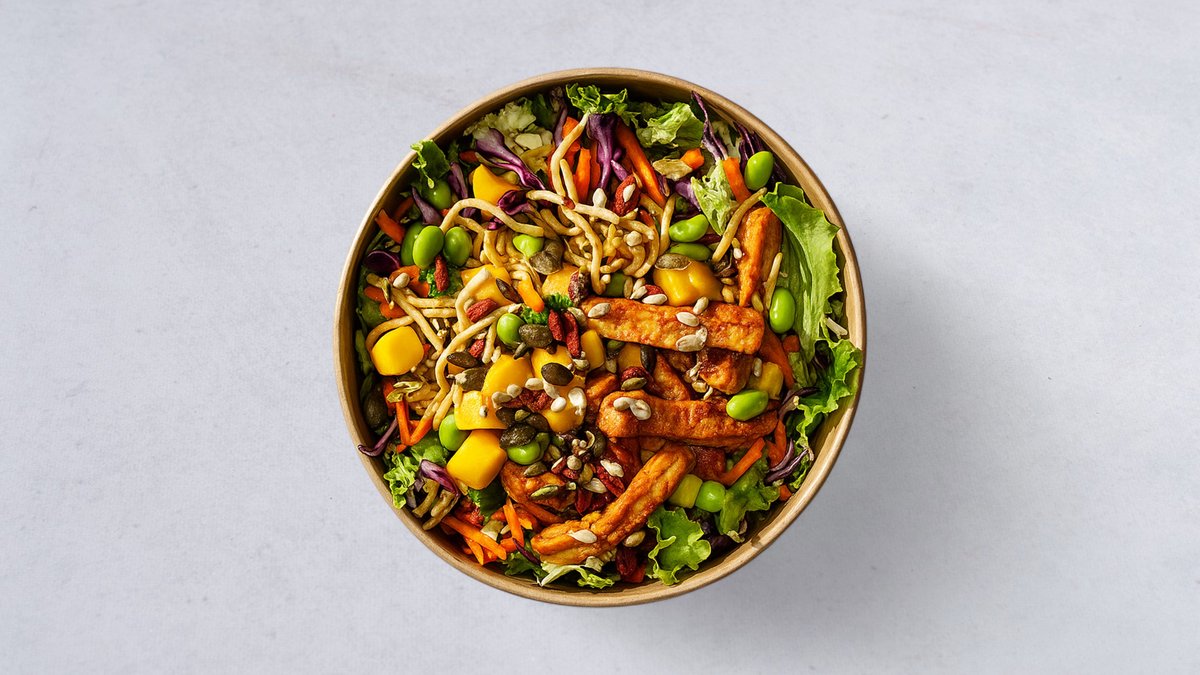 Sallad med teriyummis, sunset slaw, nudelsallad, mango, gröna sojabönor, familjesallad, sriracha och gojabär.