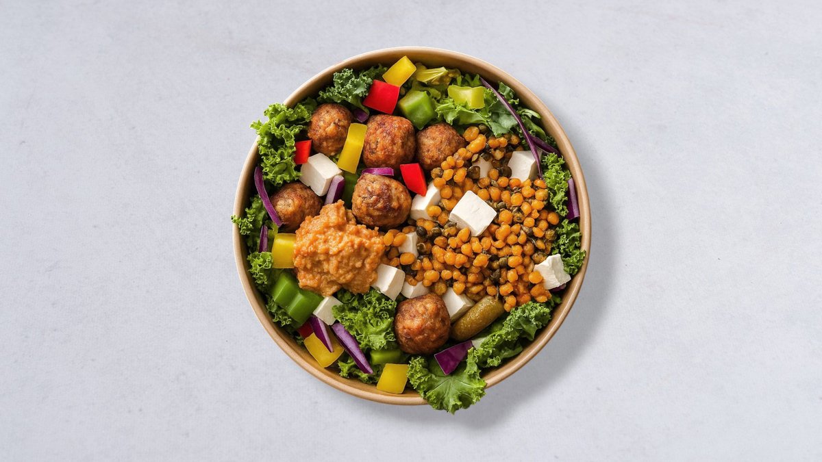 Sallad med falafel, grönkålssallad, linssallad, cornichons, napolisallad, salladsost, sötpotatisröra och vitlöksdressing.
