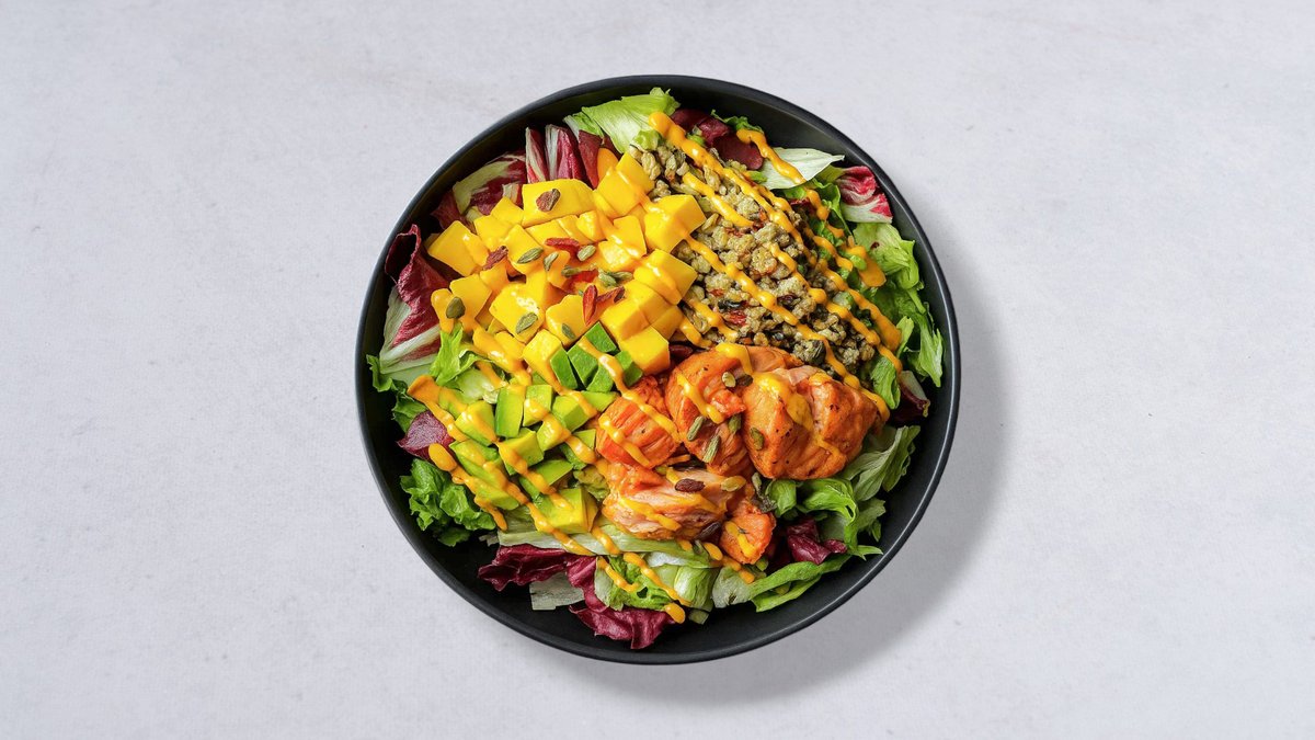 Sallad med blomkålsris, avokado, mango, gojabär, currydressing, rökt lax och sallad.