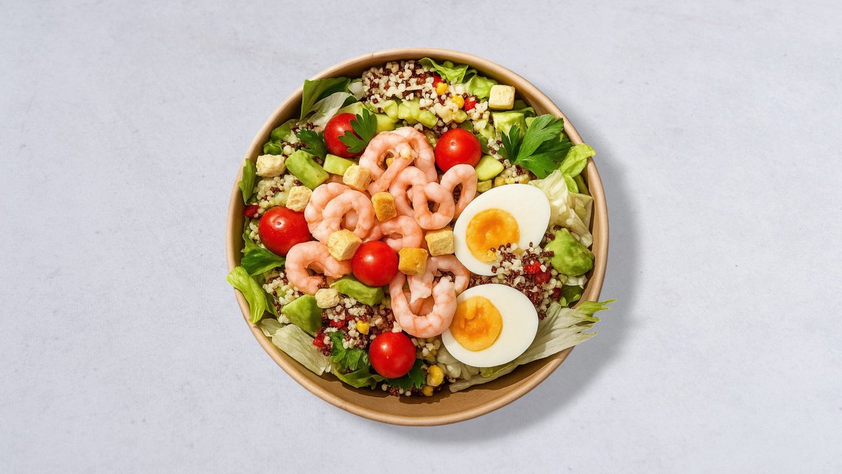 Sallad med blomkålsris, isbergssallad, avokado, kokt ägg, räkor, tomater, tärnad gurka, krutonger och rhode islanddressing.