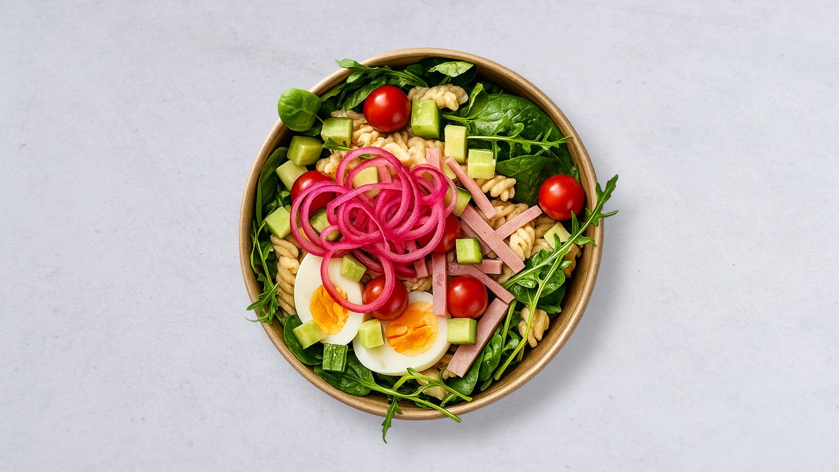 Sallad med cocktailtomater, familjesallad, kalkonskinka, kokt ägg, krämig chilipastasallad, picklad rödlök, tärnad goudaost, tärnad gurka och rhode islanddressing.