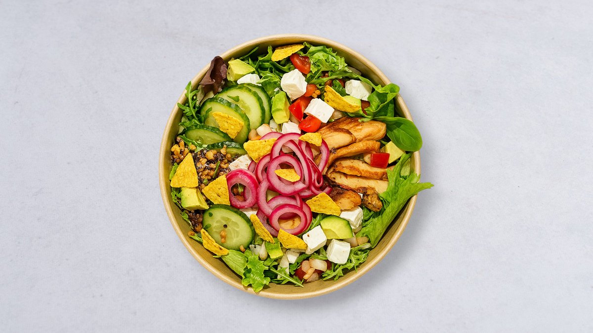 Sallad med picklad rödlök, pico de gallo, sallad, salladchips, salladsost, skivad gurka, svart quinoasallad, strimlad tacokyckling och jalapeñodressing.