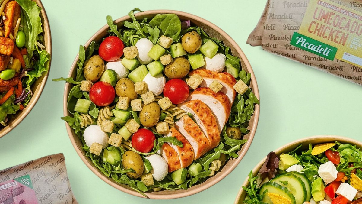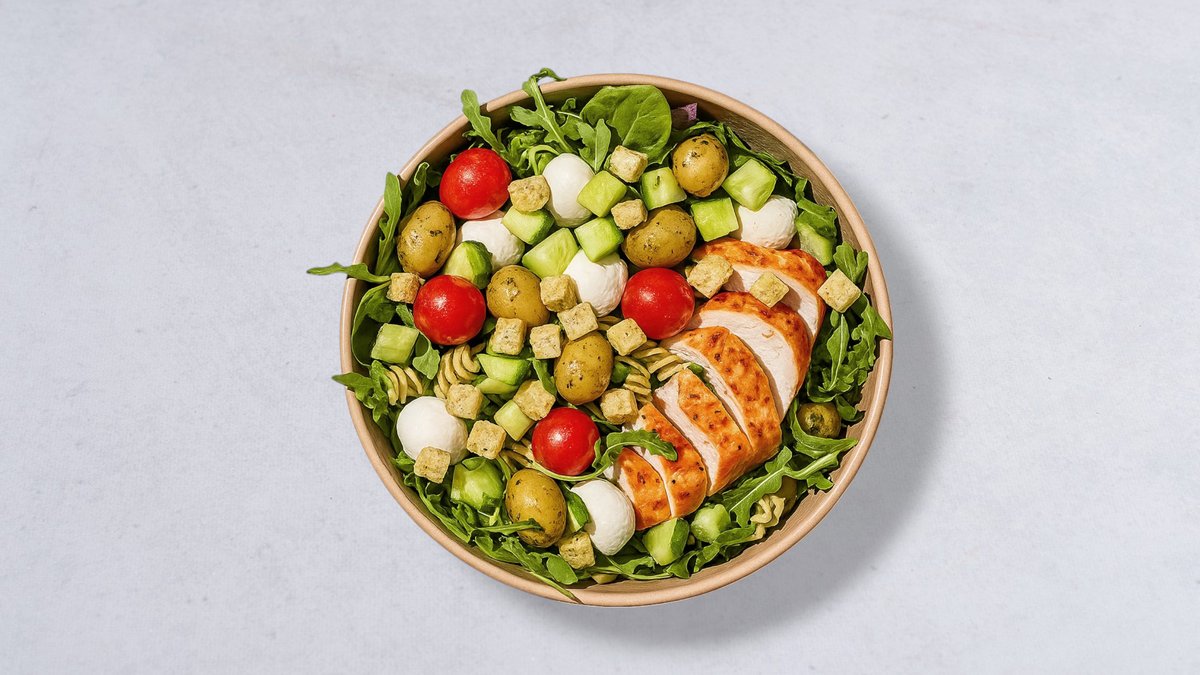 Sallad med pastasallad med pesto, mozzarella, pestodressing, familjesallad, skivad kyckling, tomater, tärnad gurka, örtmarinerade oliver och vitlökskrutonger.
