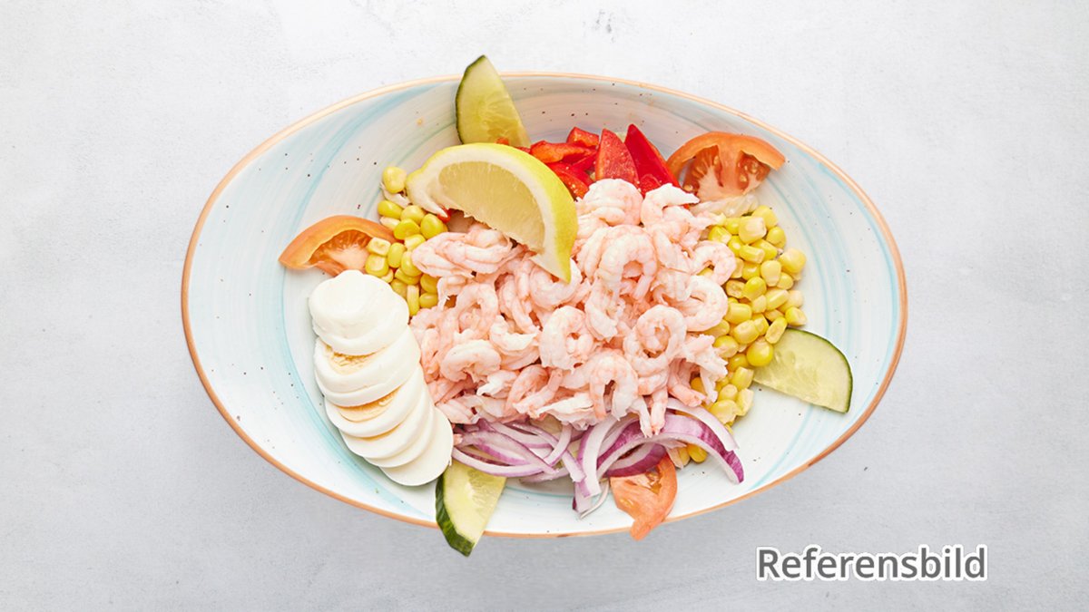 Sallad med räkor, tomat, gurka, rödlök, ägg, citronklyfta, dill samt Rhode Island dressing