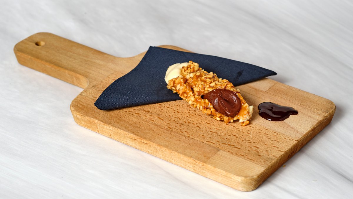 Italienskt kakrör på jordnötter fylld med hasselnöts-och vit chokladkräm