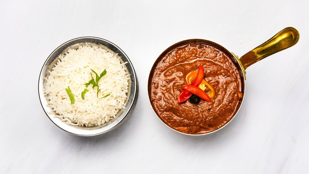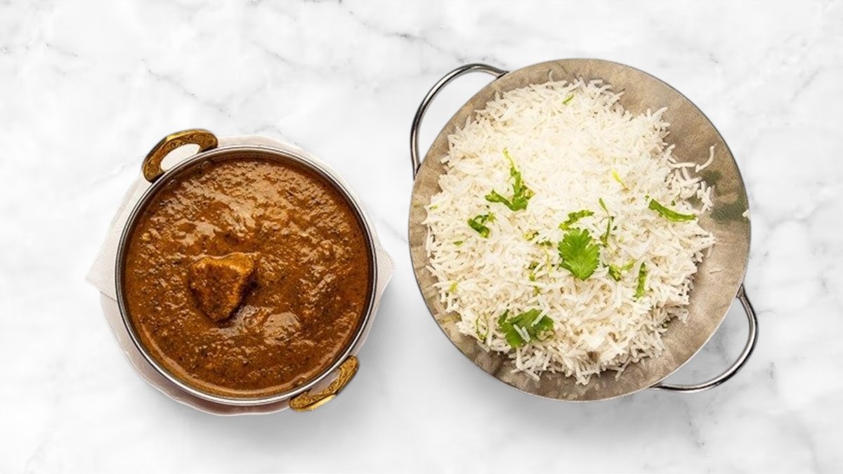 Rent lammkött kokat i sås med yoghurt, tomat och lök. Serveras med ris.