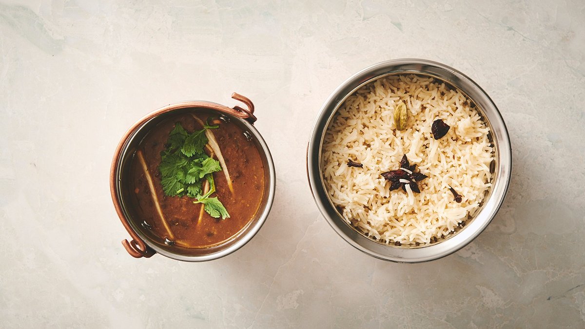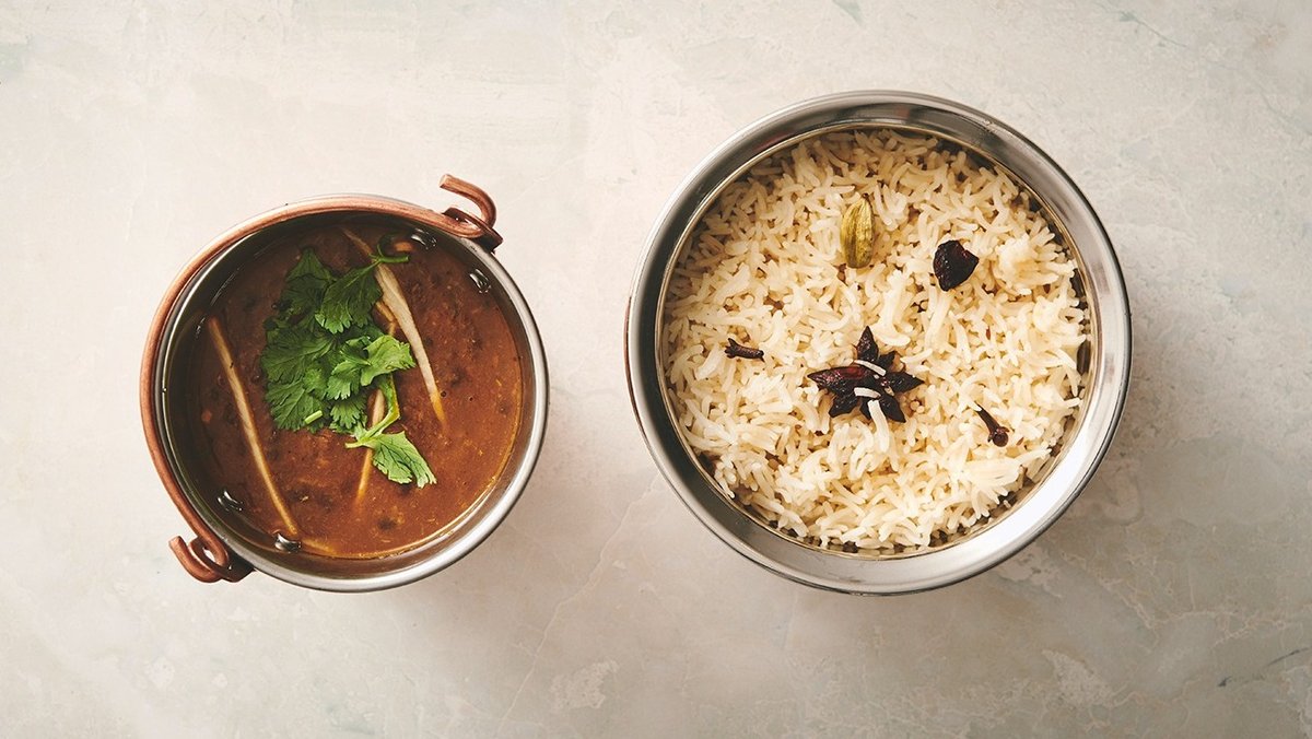 En smakfull blandning av 3 olika rätter med kött och raita. Serveras med ris.