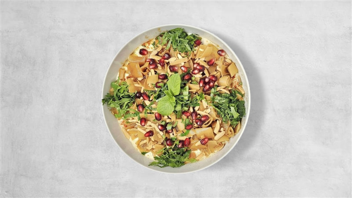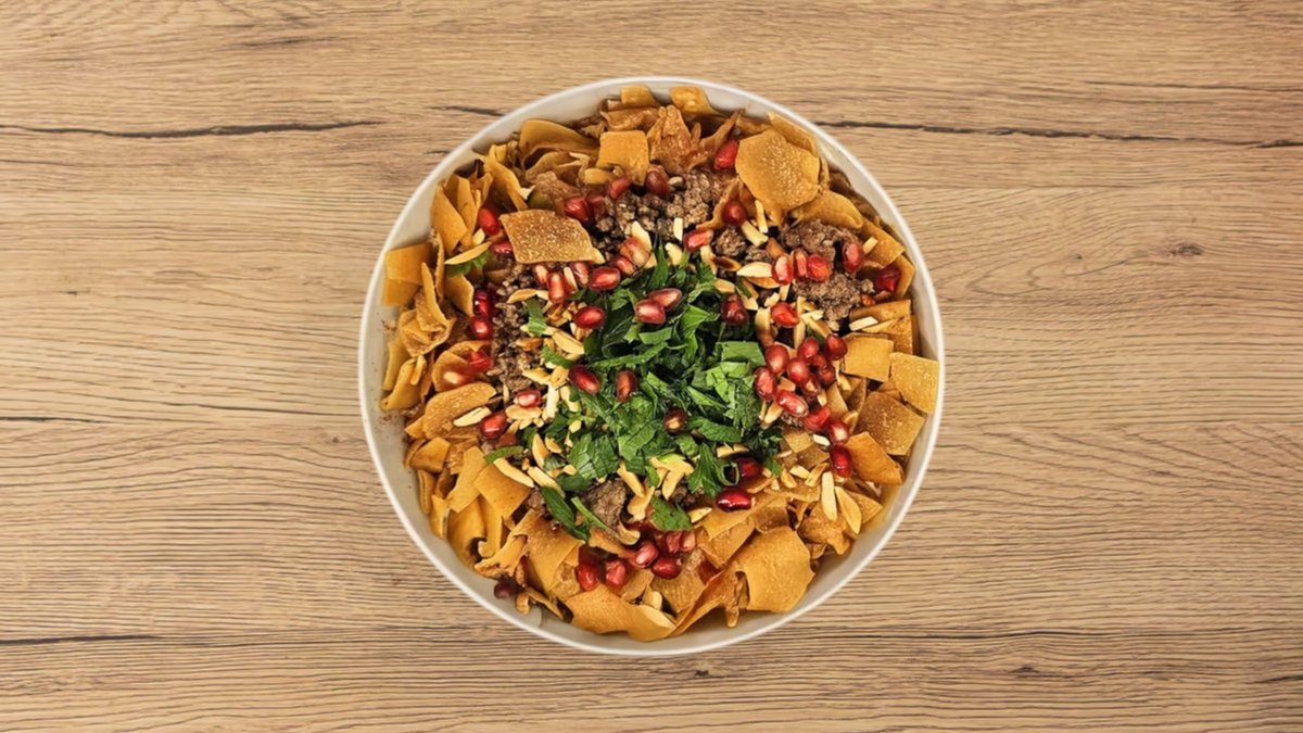 Fatteh (Tusqiaa) is a popular Levantine dish made with layers of boiled chickpeas (Hummus) and toasted bread, topped with a yogurt sauce blended with lemon juice, salt, and tahini. It's decorated with almonds fried in butter ghee, parsley, pomegranate, fried bread, cumin, and paprika.