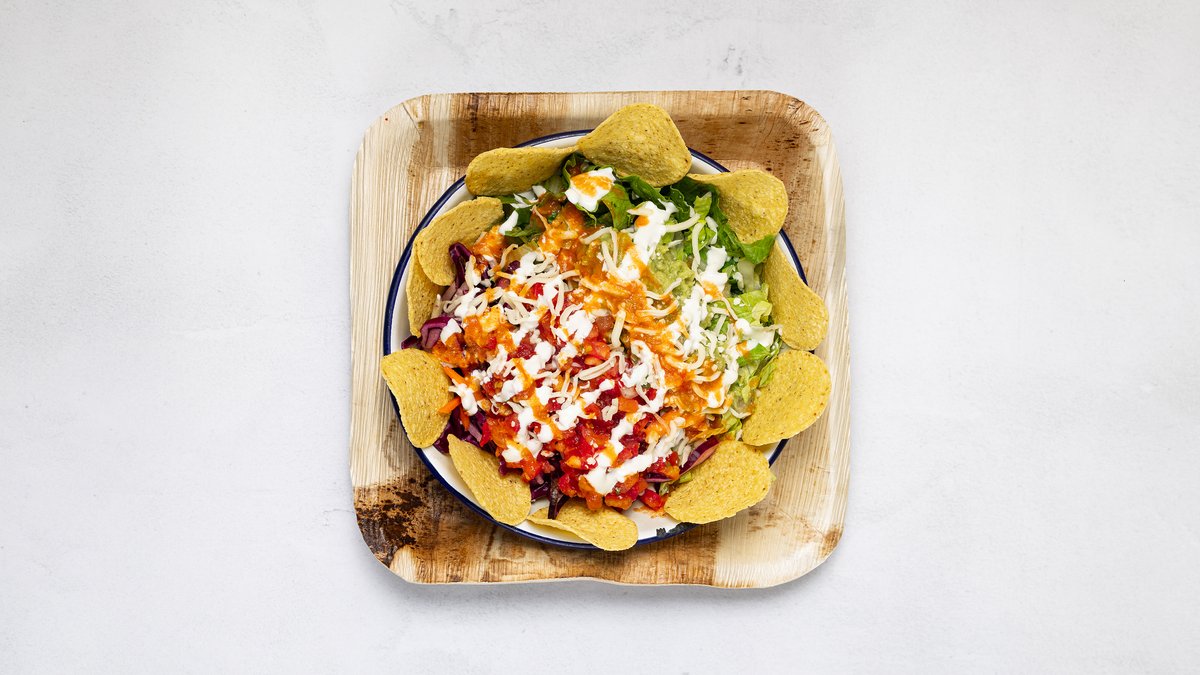 Med en bas av krispig romansallad och vår curtidosallad (mexikansk inlagd kålsallad). Serveras med Pico de Gallo och guacamole.