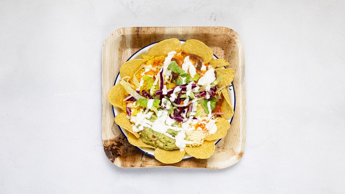 Nachos med smältost, gräddfil, guacamole och salsa.