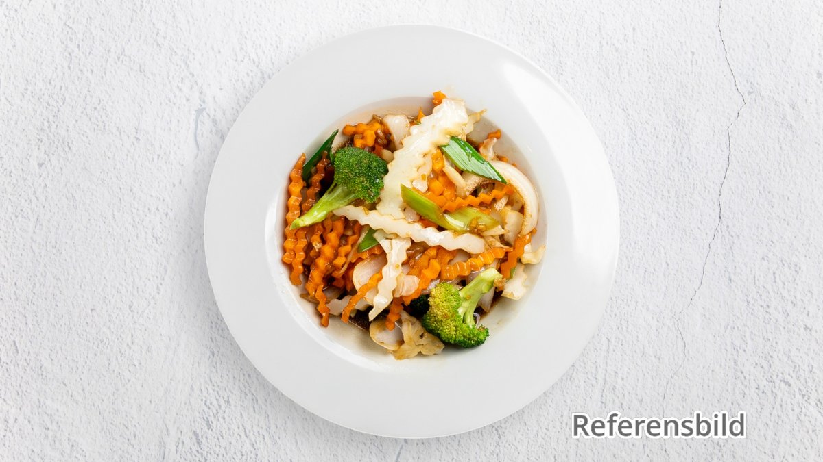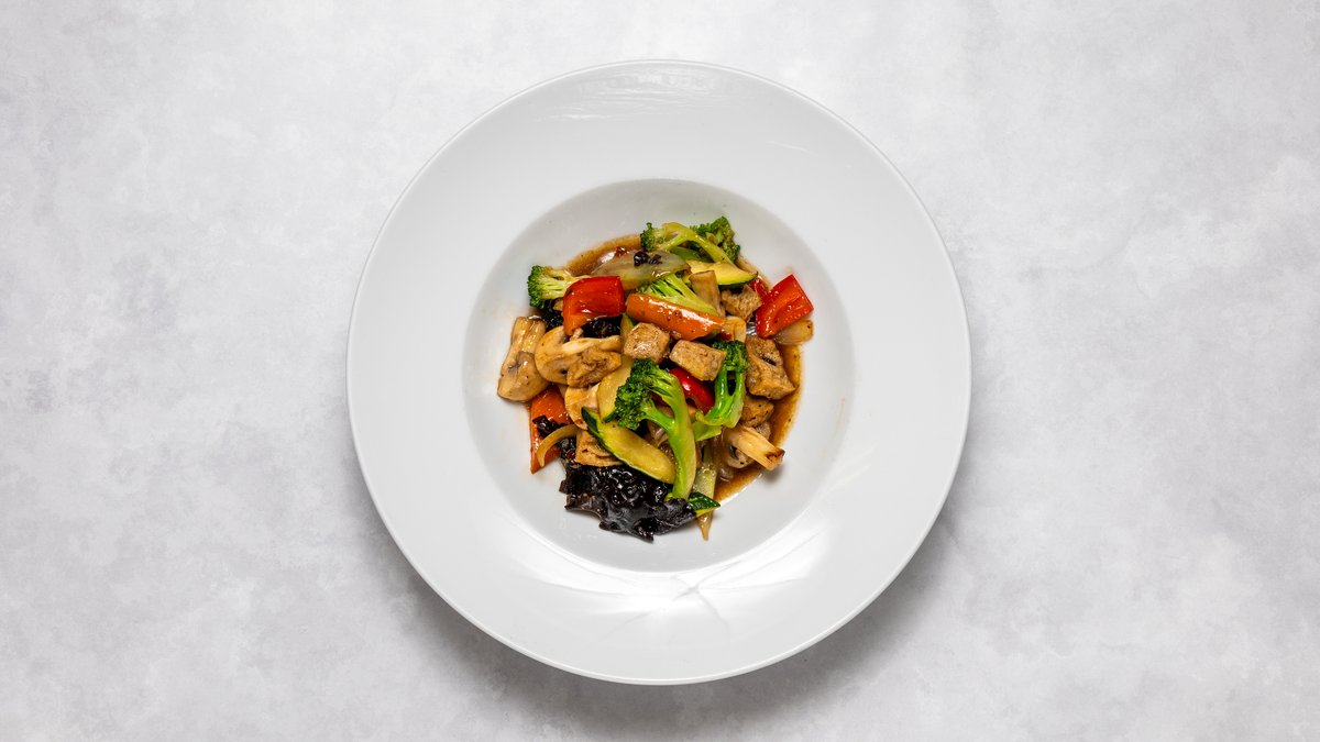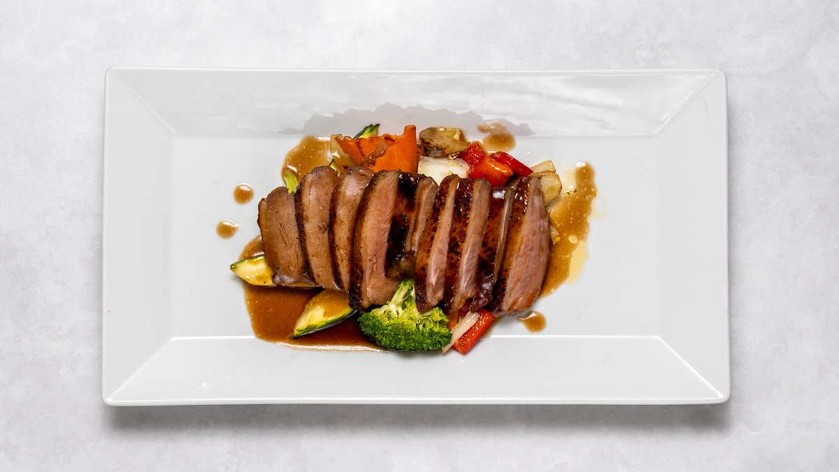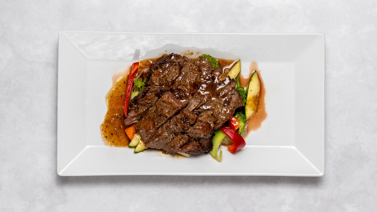 Vitlöksmarinerad oxfilé med wokade grönsaker.