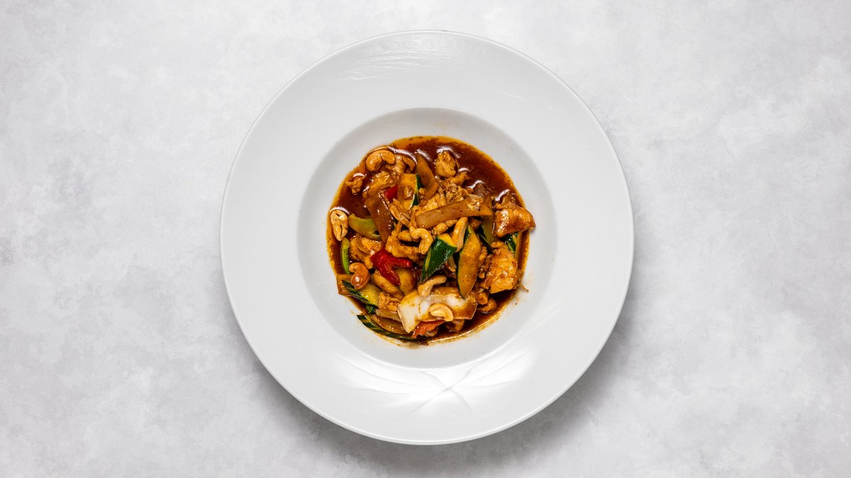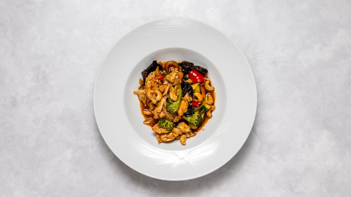 Kyckling med chiliolja, grönsaker och cashewnötter.