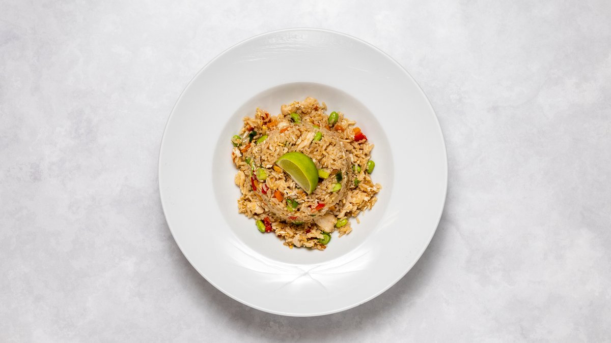 Risnudelwok med jätteräkor, ägg och jordnötter.