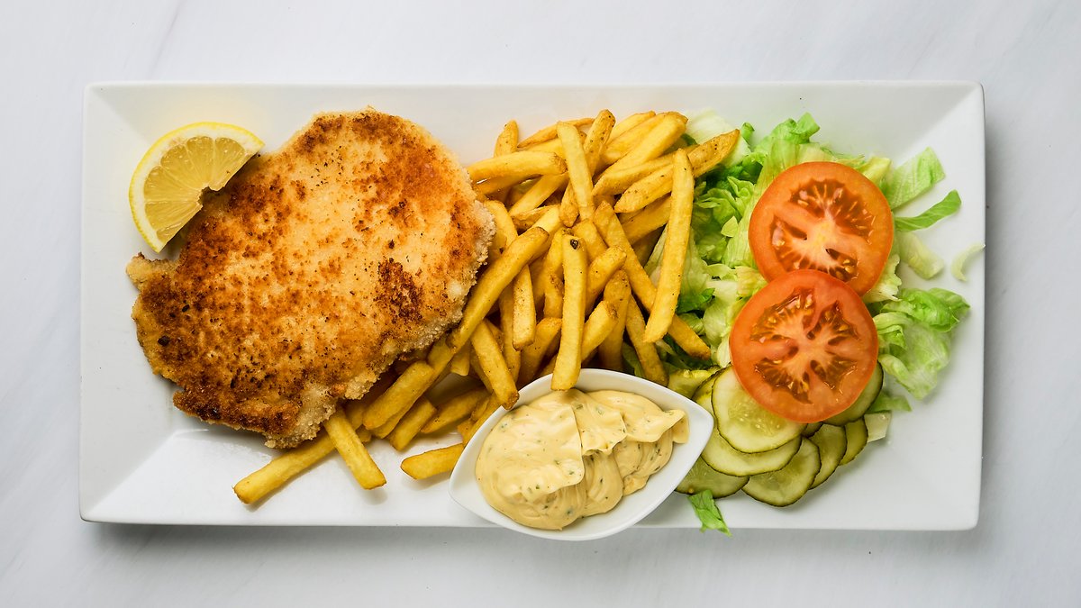 Krispig schnitzel. Serveras med pommes, remouladsås och citron.