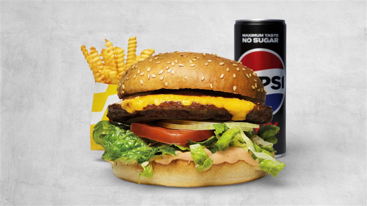 90 g hamburgare med hamburgerdressing, isbergssallad, gul lök och hamburgerost. Valfri dryck och pommez ingår.