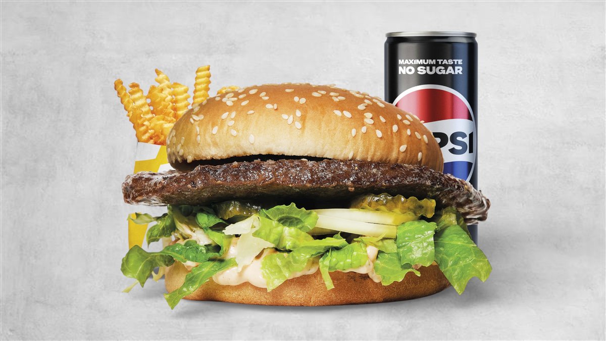 45 g hamburgare, hamburgerost, hamburgerdressing och isbergssallad. Liten pommez och valfri dryck ingår.