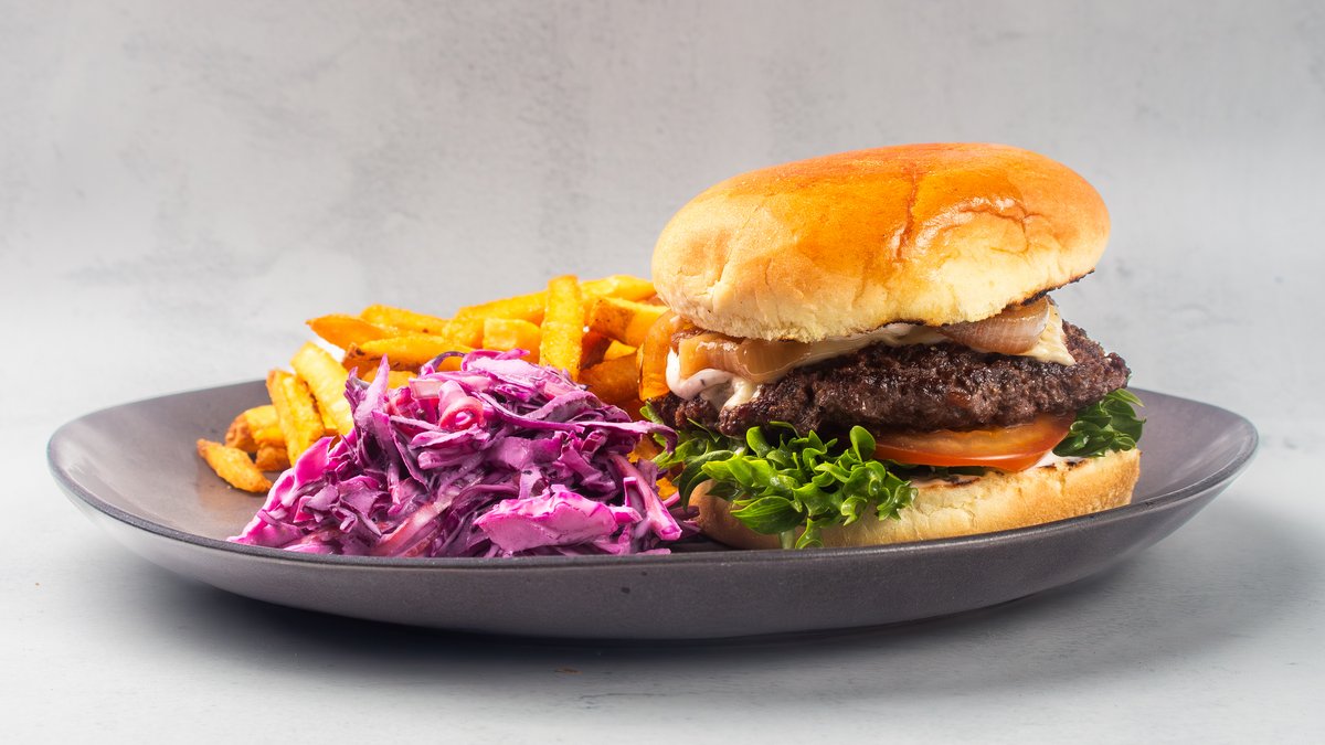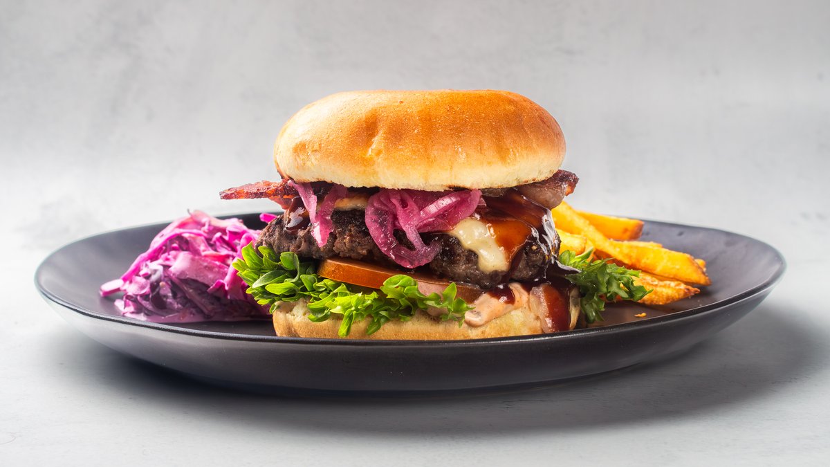160 g, dressing, krispsallad, tomat, picklad rödlök, cheddarost, bacon, BBQ-sås, pommes, coleslaw.